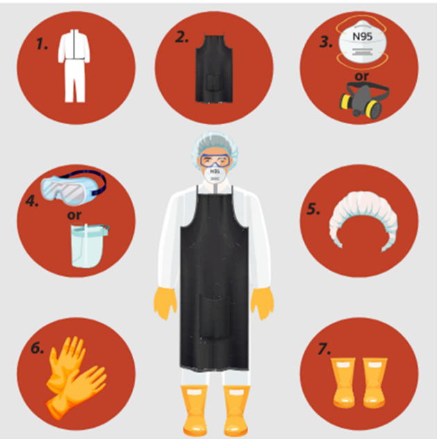 - unikaj dotykania chorego lub martwego ptactwa bez zabezpieczenia w środki ochrony osobistej (zawsze zakładaj: fartuch/kombinezon, rękawice, maski ochronne FFP3, gogle, ochraniacze obuwia, czepek na głowę)