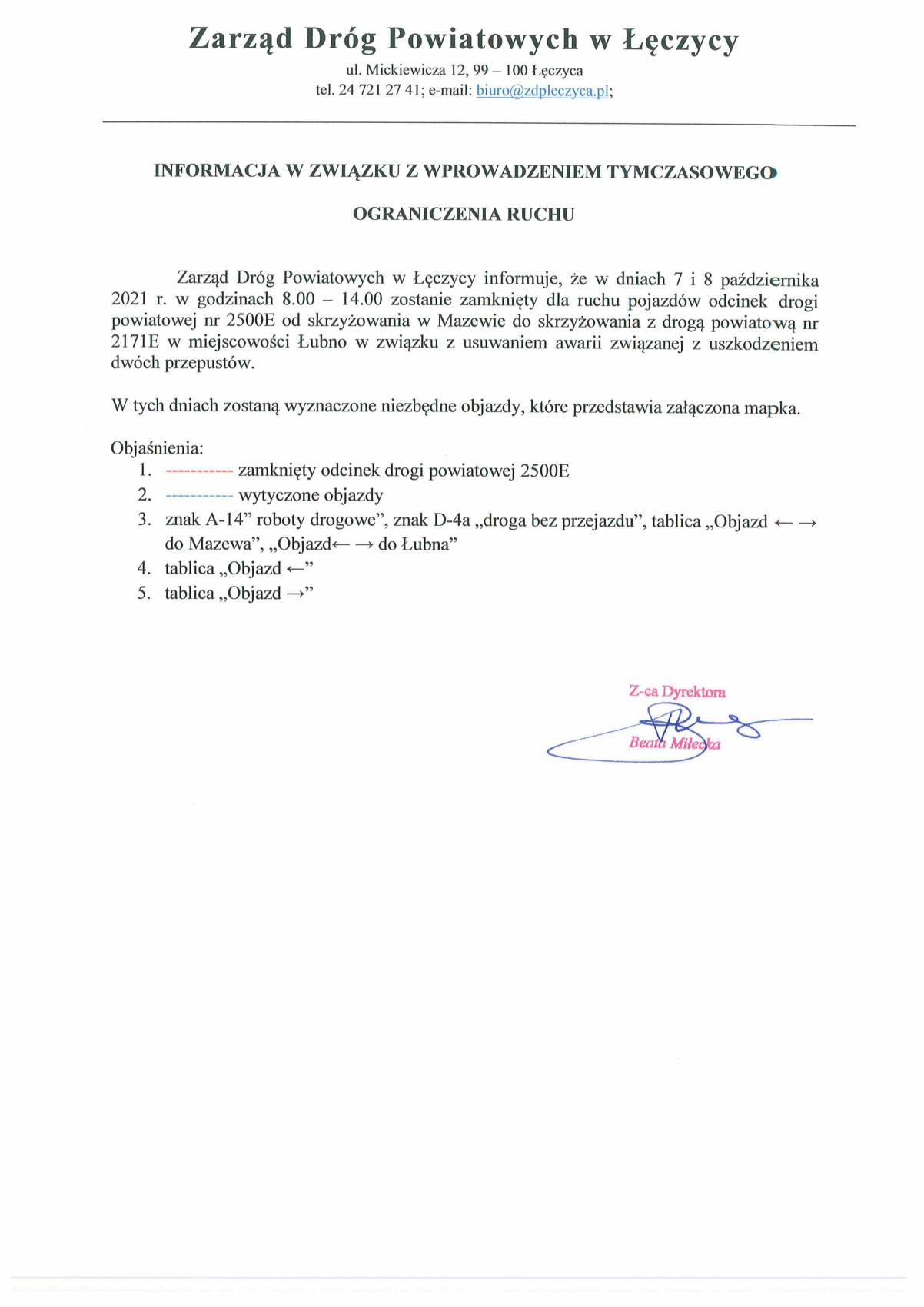 Zarząd Dróg Powiatowych w Łęczycy informuje, że w dniach 7 i 8 października 2021 r. w godzinach 8:00-14:00 zostanie zamknięty ruch pojazdów.