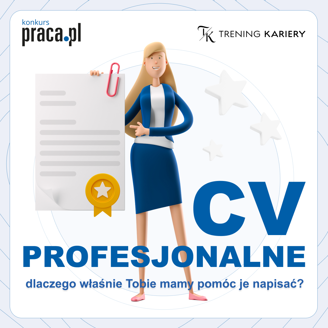 Portal Praca.pl wraz ze swoim partnerem Trening Kariery właśnie rusza z konkursem„Profesjonalne CV – dlaczego właśnie Tobie mamy pomóc je napisać?", w którym główną nagrodą będzie pomoc w przygotowaniu CV. Naszym celem jest zachęcenie wszystkich uczestników do tego by budowali swoją karierę w sposób bardziej przemyślany i świadomy, jak również do tego by aktywnie poszukiwali nowych wyzwań. Do udziału w konkursie zapraszamy wszystkich, którzy ukończyli 18 lat.