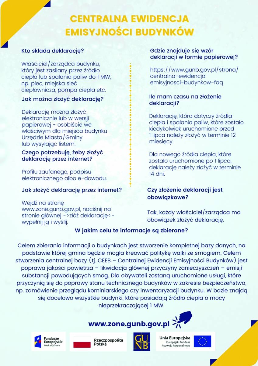 Od 1 lipca br. każdy właściciel lub zarządca budynku będzie zobowiązany do złożenia w Centralnej Ewidencji Emisyjności Budynków (CEEB) deklaracji dotyczącej źródeł ciepła i spalania paliw. Szczegółowe informacje na temat CEEB znajdą Państwo w materiałach informacyjnych zamieszczonych poniżej oraz na stronie internetowej: www.zone.gunb.gov.pl