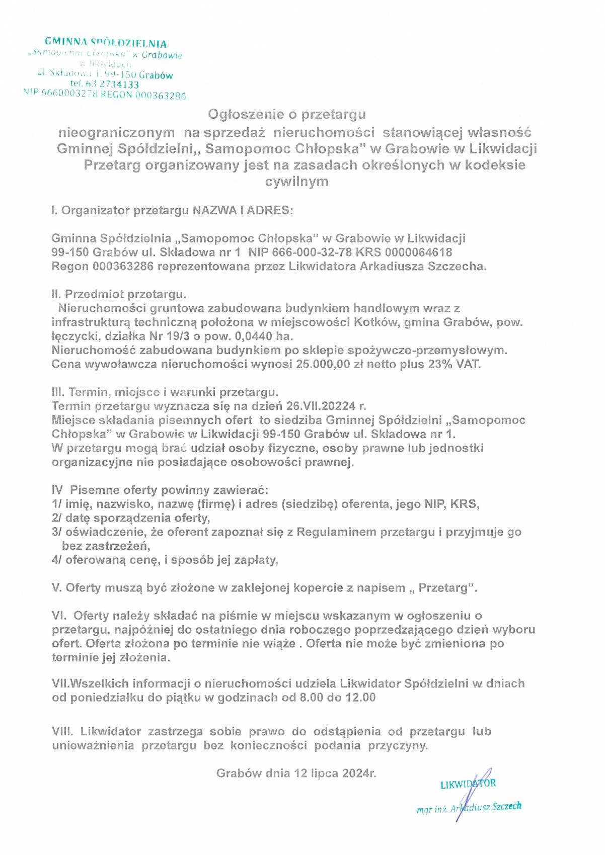 Ogłoszenie o przetargu nieograniczonym na sprzedaż nieruchomości, stanowiącej własność GS w Grabowie