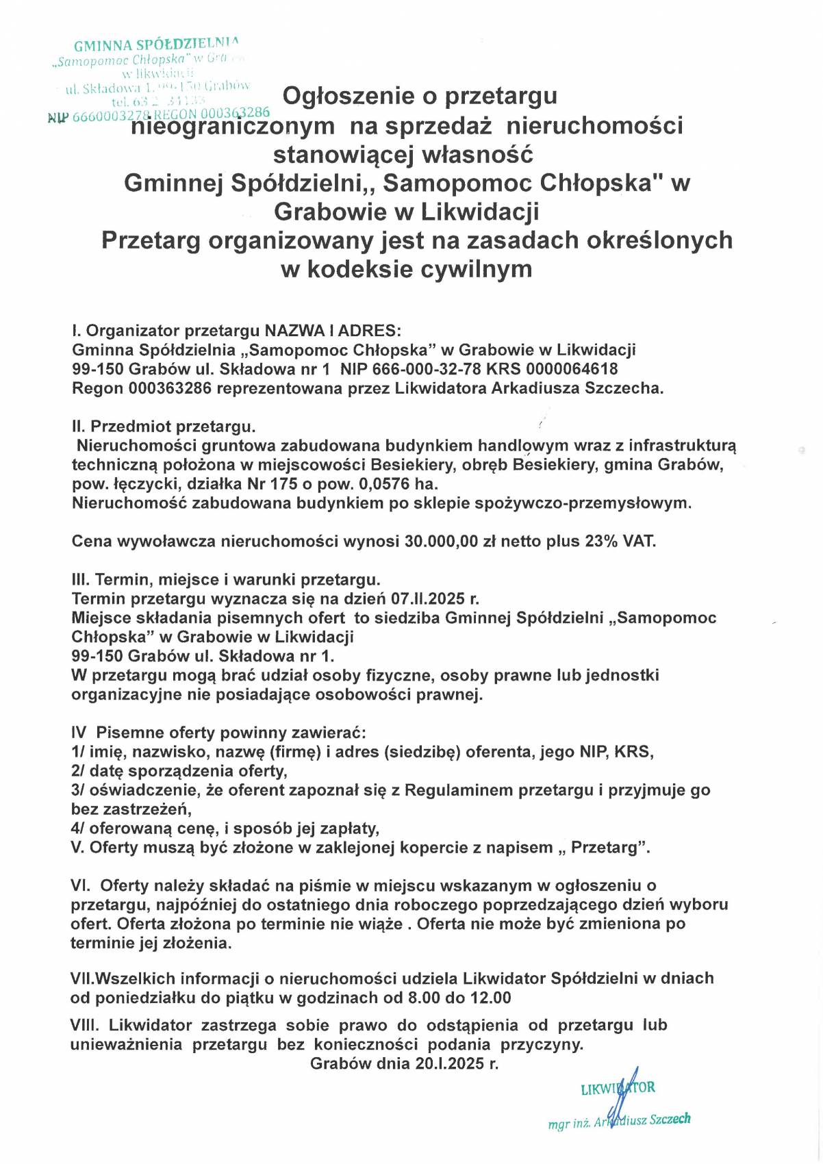 Ogłoszenie o przetargu nieograniczonym na sprzedaż nieruchomości, stanowiącej własność GS w Grabowie w miejscowości Besiekiery
