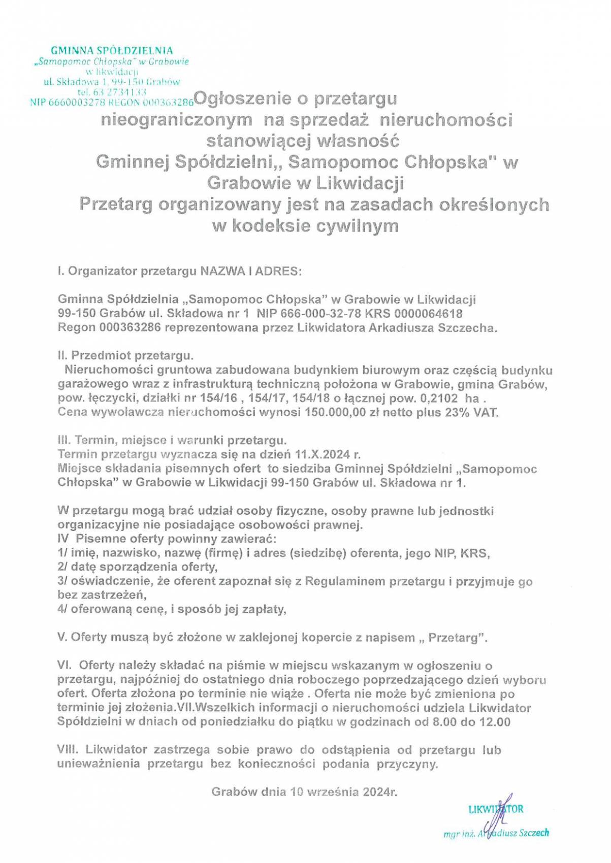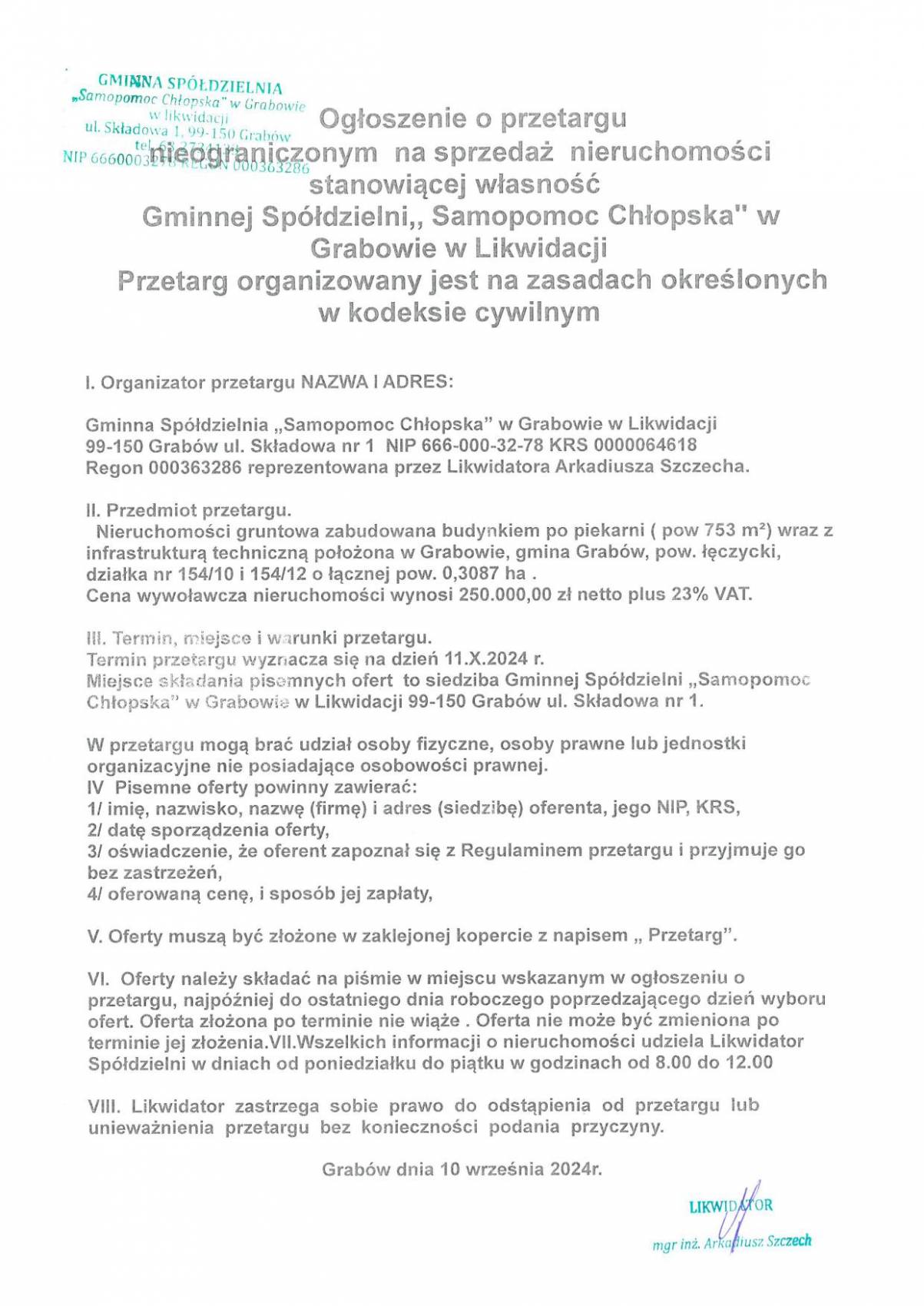 Ogłoszenie o przetargu nieograniczonym na sprzedaż nieruchomości stanowiącej własność Gminnej Spółdzielni "Samopomoc Chłopska" w Grabowie położonej w miejscowości Grabów