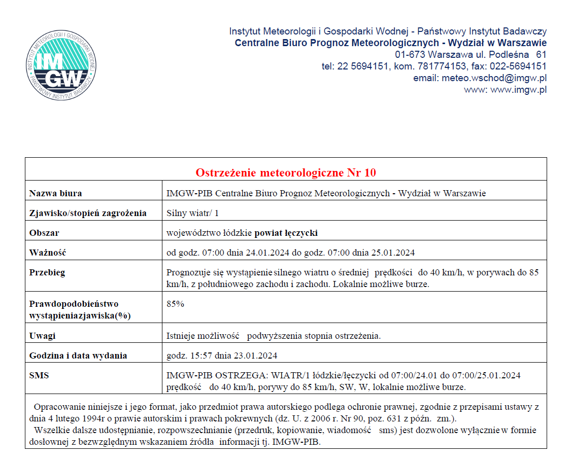 Ostrzeżenie meteorologiczne I stopnia - SILNY WIATR