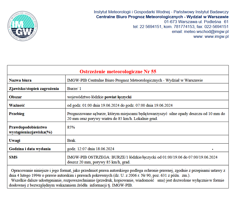 Ostrzeżenie meteorologiczne I stopnia - Burze