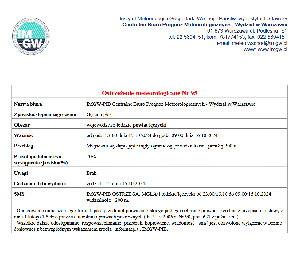 Ostrzeżenie meteorologiczne I stopnia Gęsta mgła