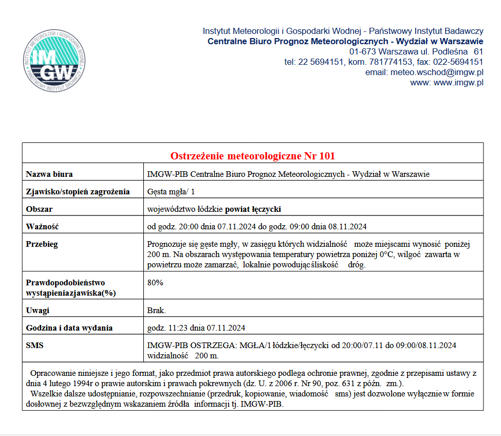 Ostrzeżenie meteorologiczne I stopnia GĘSTA MGŁA