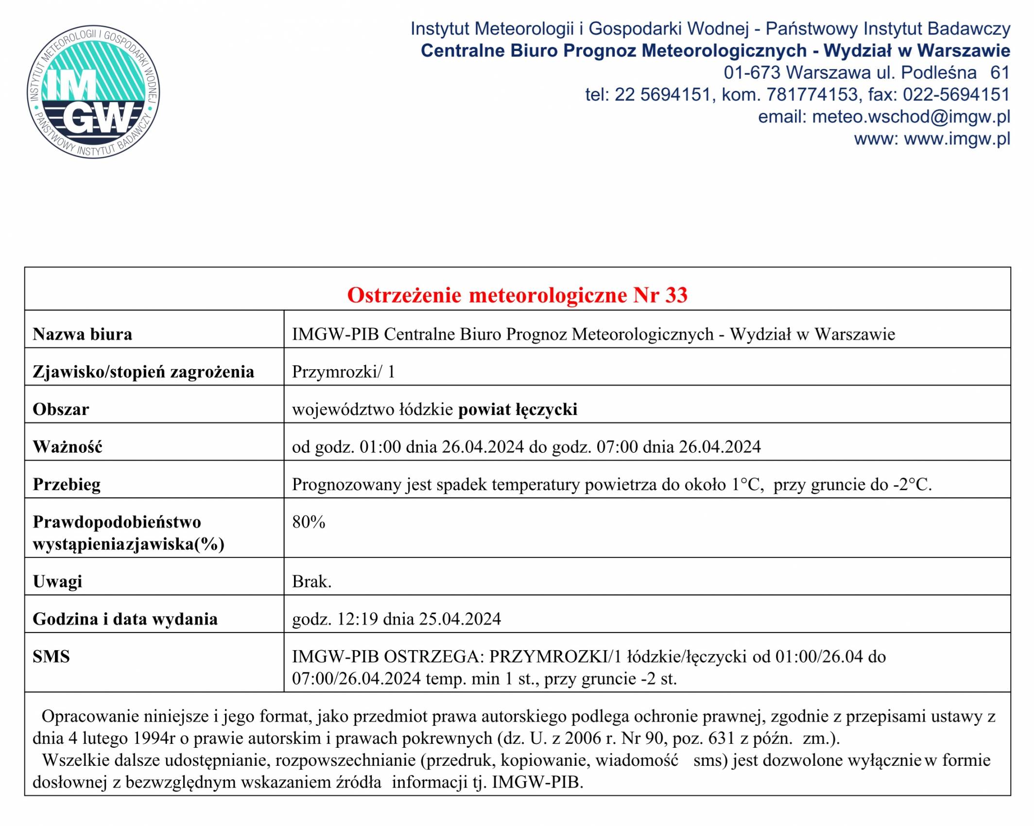 Ostrzeżenie meteorologiczne I stopnia - Przymrozki