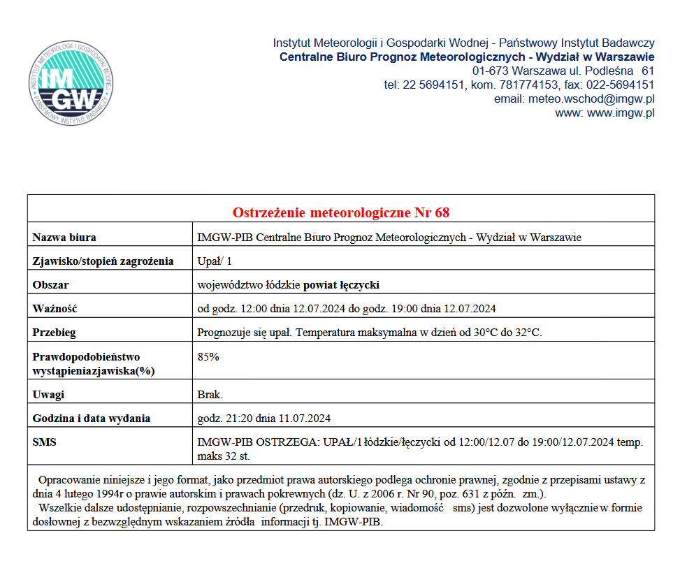 Ostrzeżenie meteorologiczne I stopnia UPAŁ