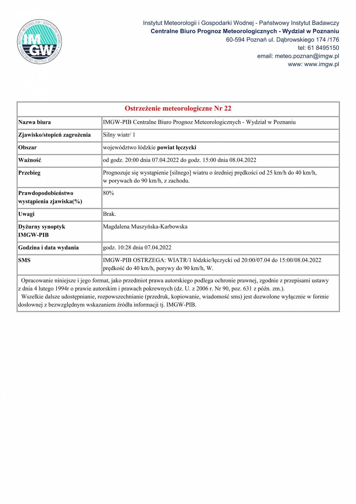 Prognozuje się wystąpienie [silnego] wiatru o średniej prędkości od 25 km/h do 40 km/h, w porywach do 90 km/h, z zachodu.