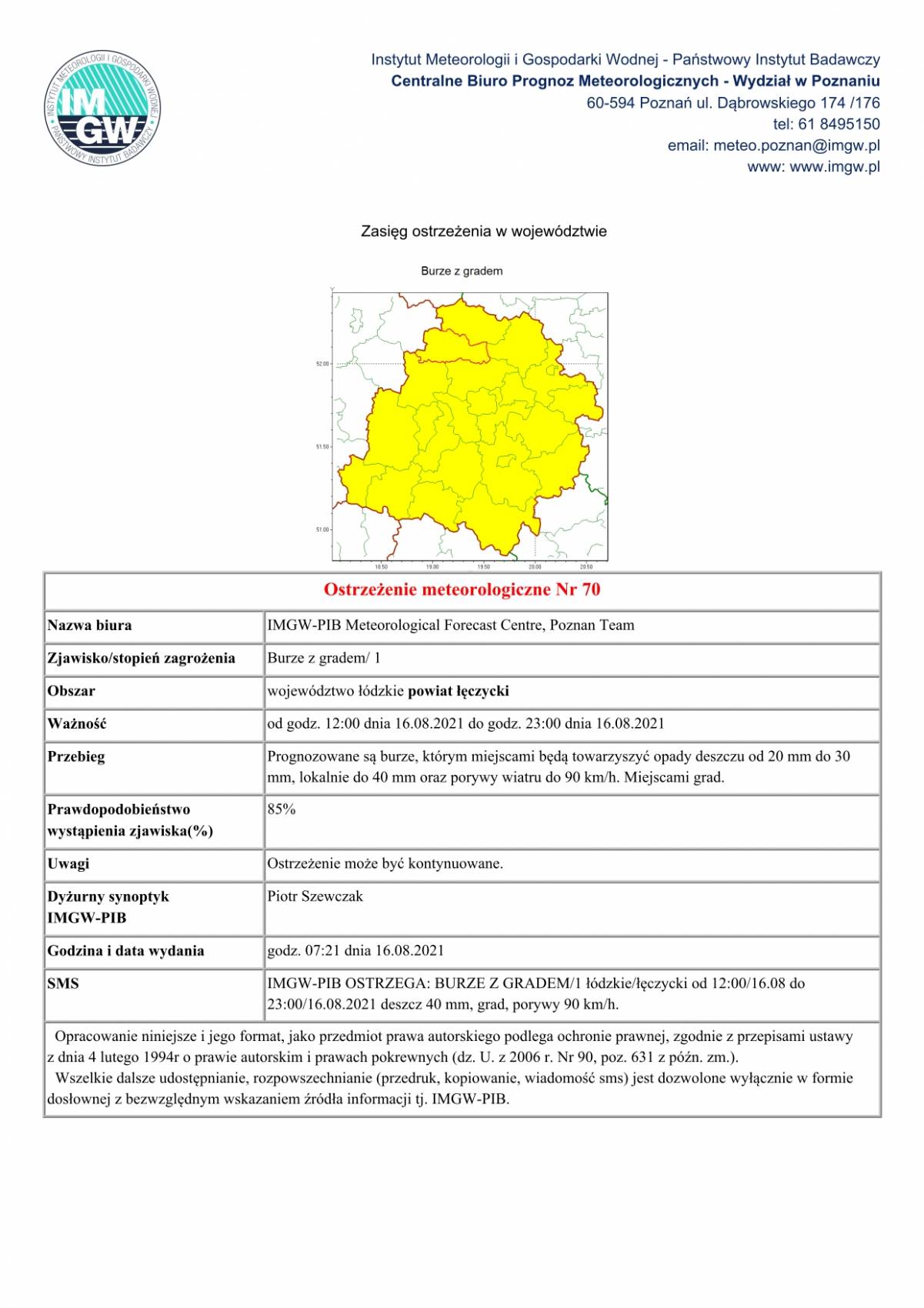 Prognozowane są burze, którym miejscami będą towarzyszyć opady deszczu od 20 mm do 30 mm, lokalnie do 40 mm oraz porywy wiatru do 90 km/h. Miejscami grad.Prawdopodobieństwo wystąpienia zjawiska 85%