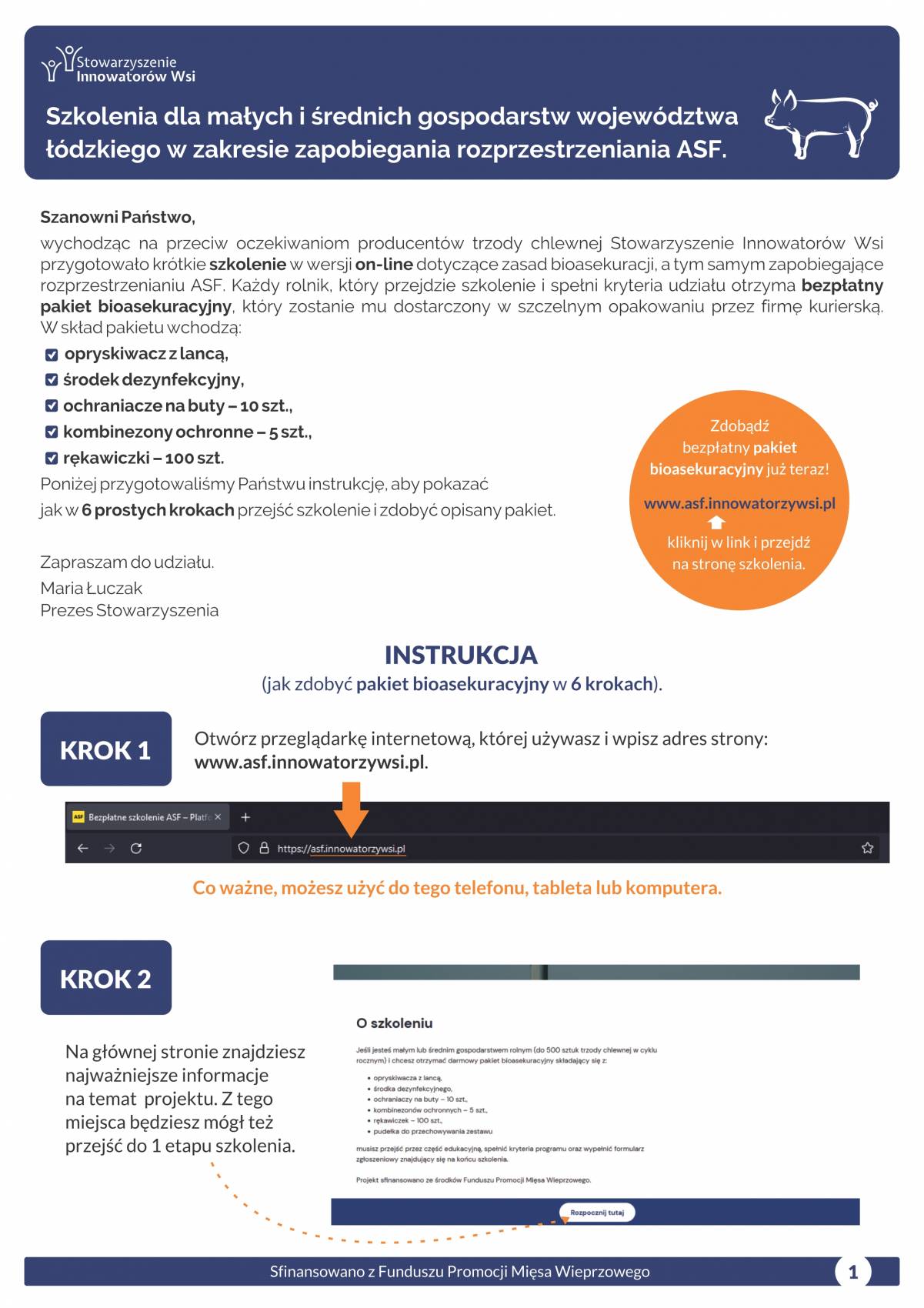 Stowarzyszenie Innowatorów Wsi przygotowało krótkie szkolenie w wersji on-line dotyczące zasad bioasekuracji, a tym samym zapobiegające rozprzestrzenianiu ASF. Każdy rolnik, który przejdzie szkolenie i spełni kryteria udziału otrzyma bezpłatny pakiet bioasekuracyjny