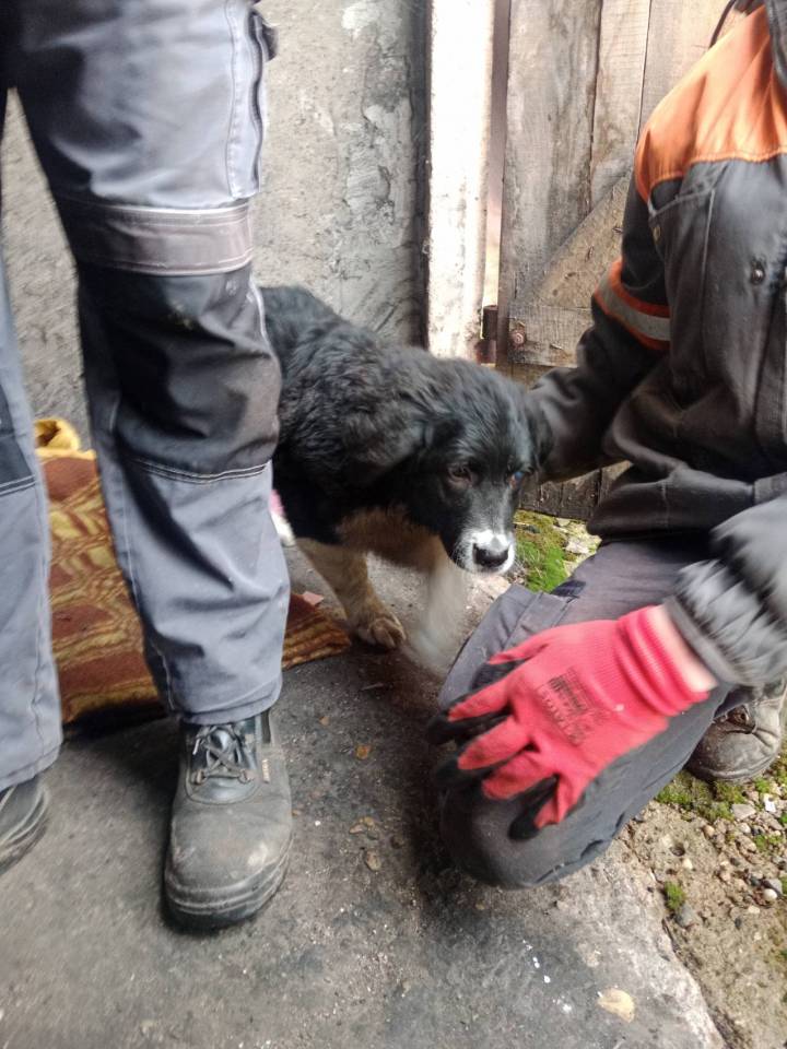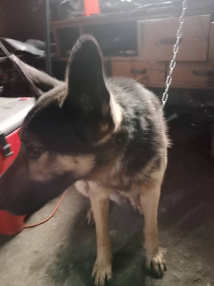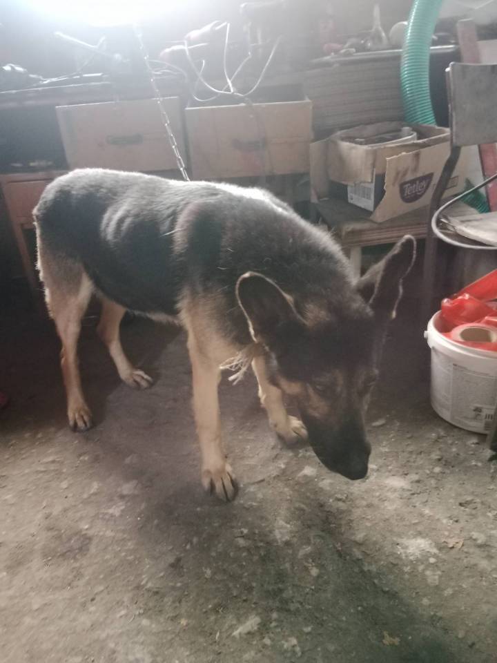 Jeden z piesków to dorosły Owczarek Niemiecki Krótkowłosy. Na szyi miał uwiązany łańcuch.