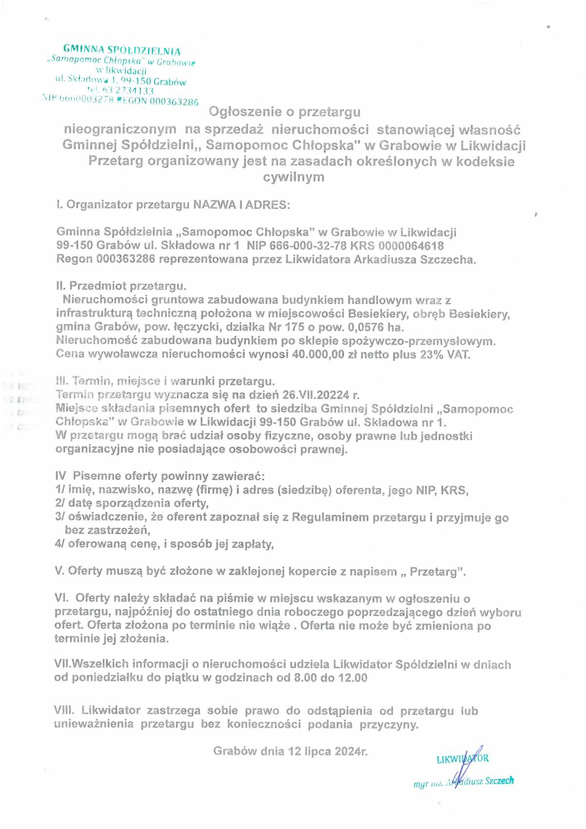 Ogłoszenie o przetargu nieograniczonym na sprzedaż nieruchomości, stanowiącej własność GS w Grabowie w miejscowości Besiekiery