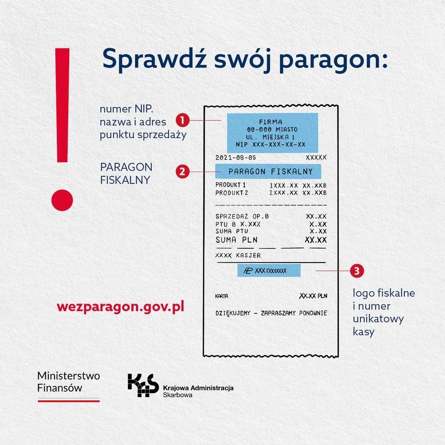 Krajowa Administracja Skarbowa (KAS) wspiera uczciwych przedsiębiorców, jednak w przypadku oszustw paragonowych ogromne znaczenie ma postawa kupujących, czyli nas wszystkich. Paragony fiskalne są gwarancją dla klientów i dowodem na uczciwość przedsiębiorcy, który przestrzega zasad rynkowej konkurencji. Prawidłowo wystawiony paragon fiskalny posiada stosowne oznaczenia. Dzięki nim będziesz mieć pewność, że transakcja została rozliczona prawidłowo. Zainstaluj bezpłatną aplikację e-Paragony, która daje możliwość gromadzenia paragonów w jednym miejscu – na smartfonie.