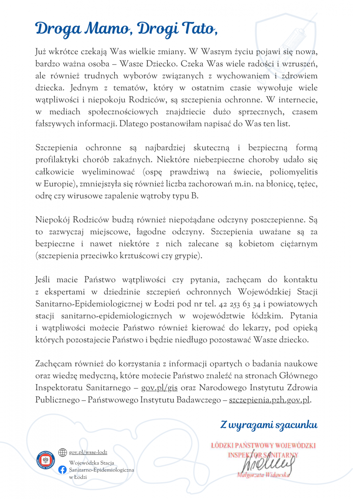 W załączeniu przesyłamy list Łódzkiego Państwowego Wojewódzkiego Inspektora Sanitarnego zachęcający do szczepienia dzieci. Zapraszamy wszystkich do zapoznania się z nim.