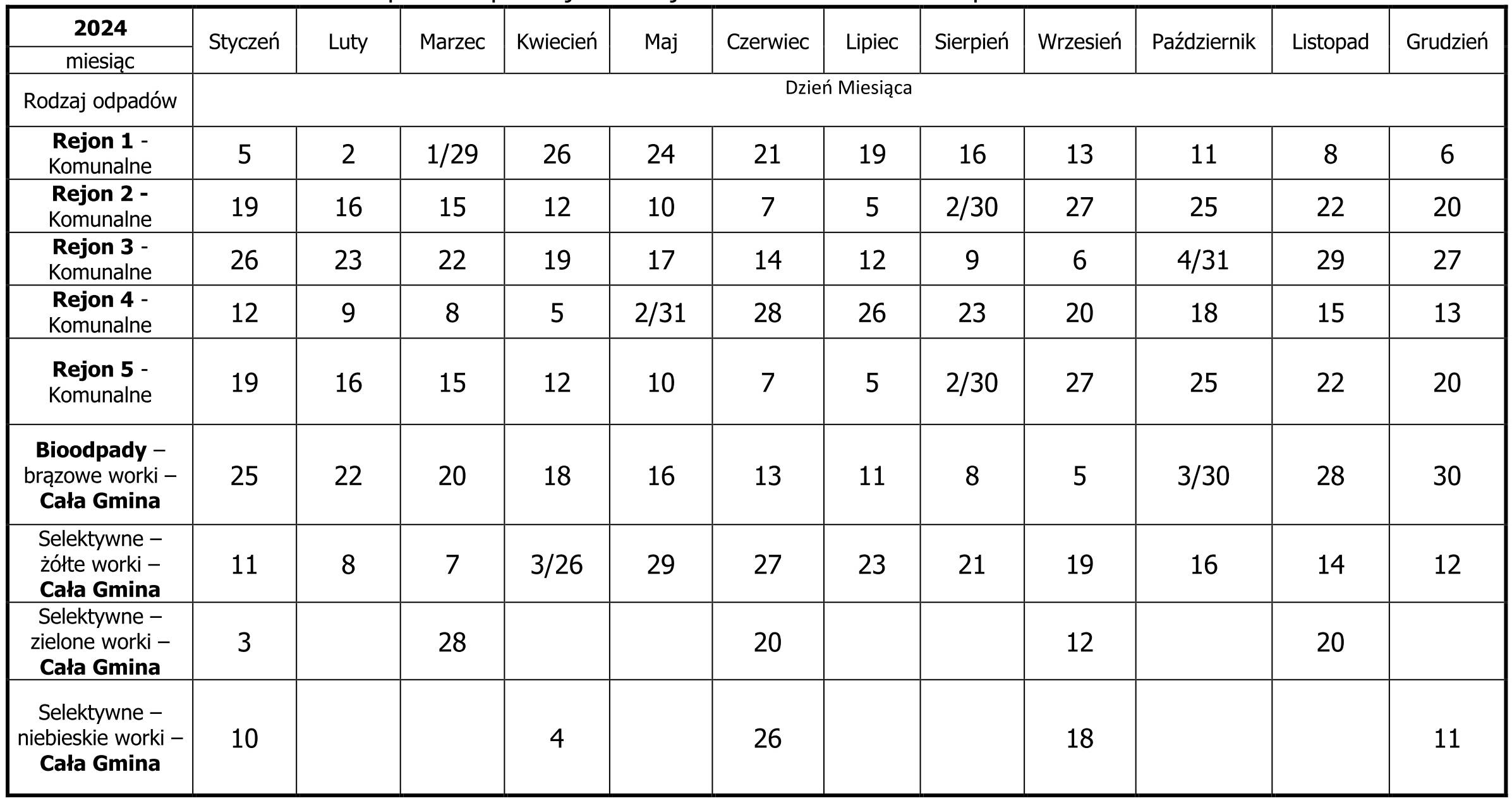 PreZero Service Centrum Sp. z o.o. poniżej informuje o terminach odbioru odpadów od 01.01.2024r. do 31.12.2024r.