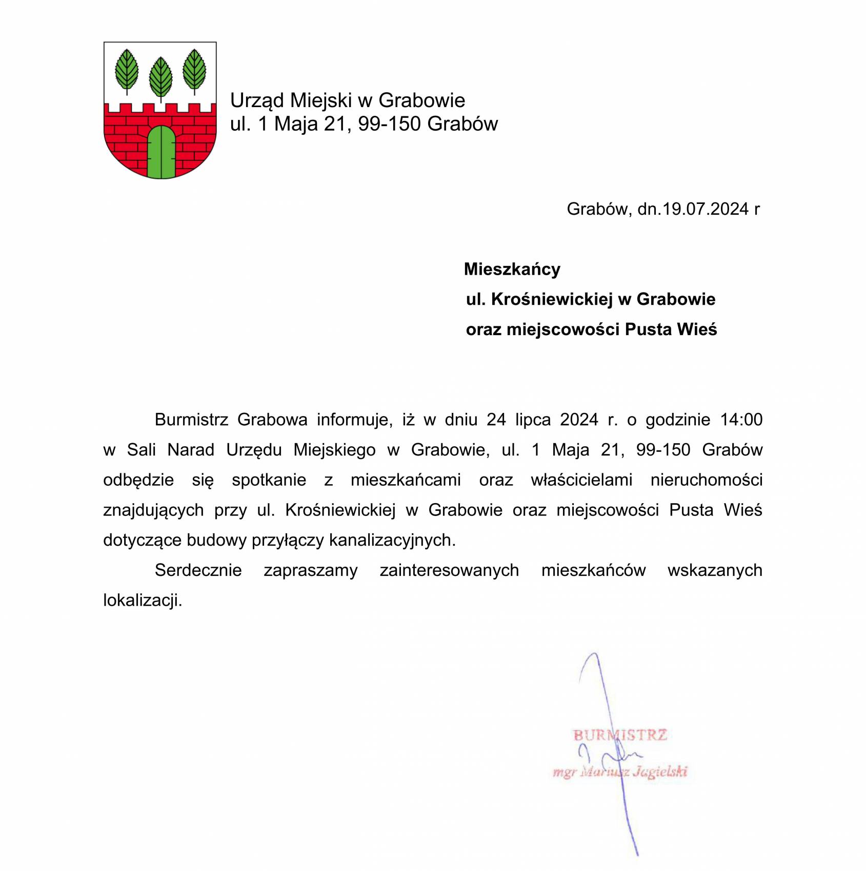 Informacja dla mieszkańców ul. Krośniewickiej w Grabowie oraz miejscowości Pusta Wieś dotyczące budowy przyłączy kanalizacyjnych