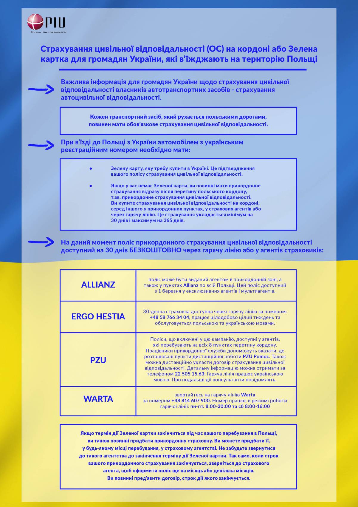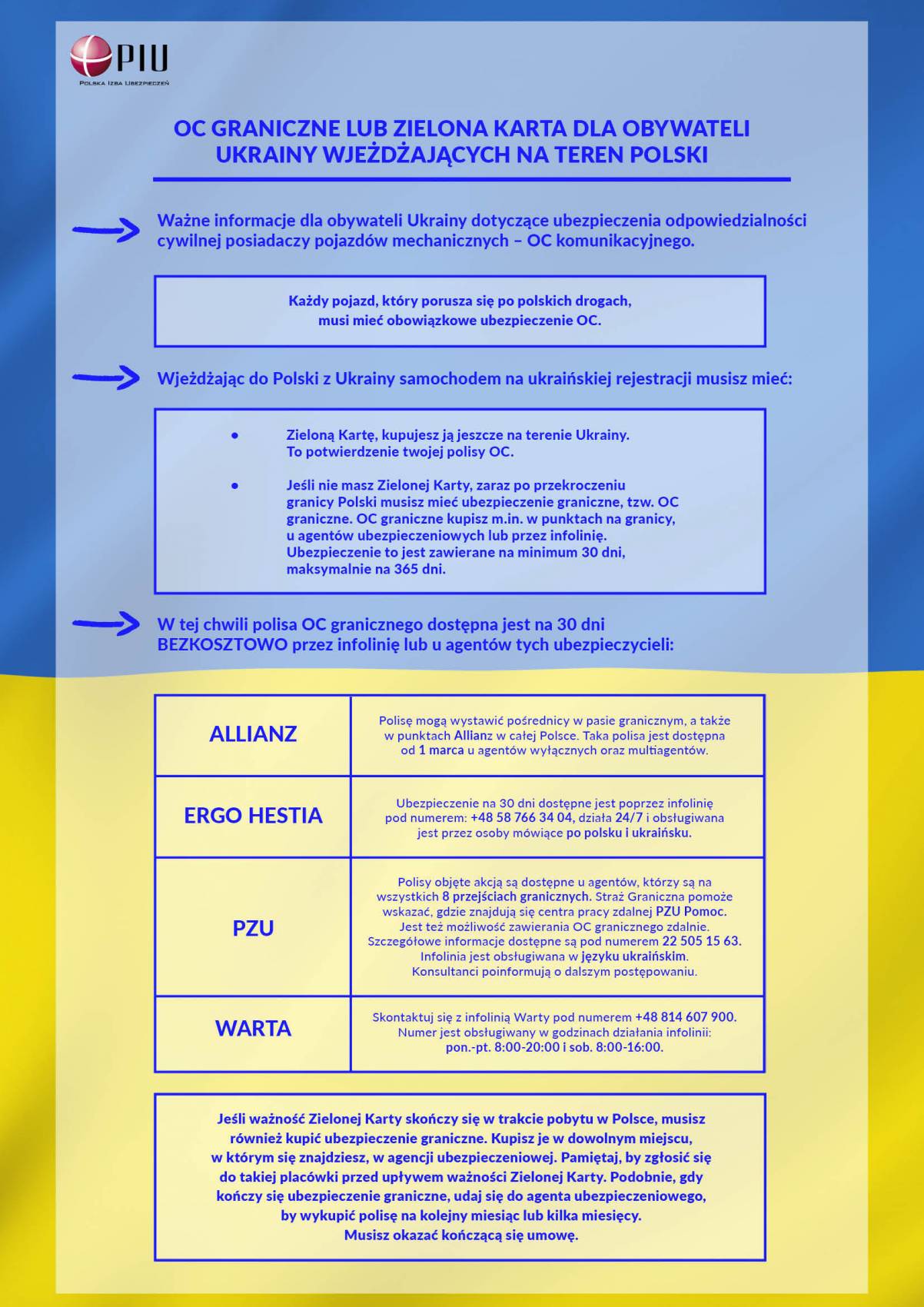 Tu znajdziecie Państwo więcej informacji: https://piu.org.pl/oc-graniczne-lub-zielona-karta-dla-obywateli-ukrainy/