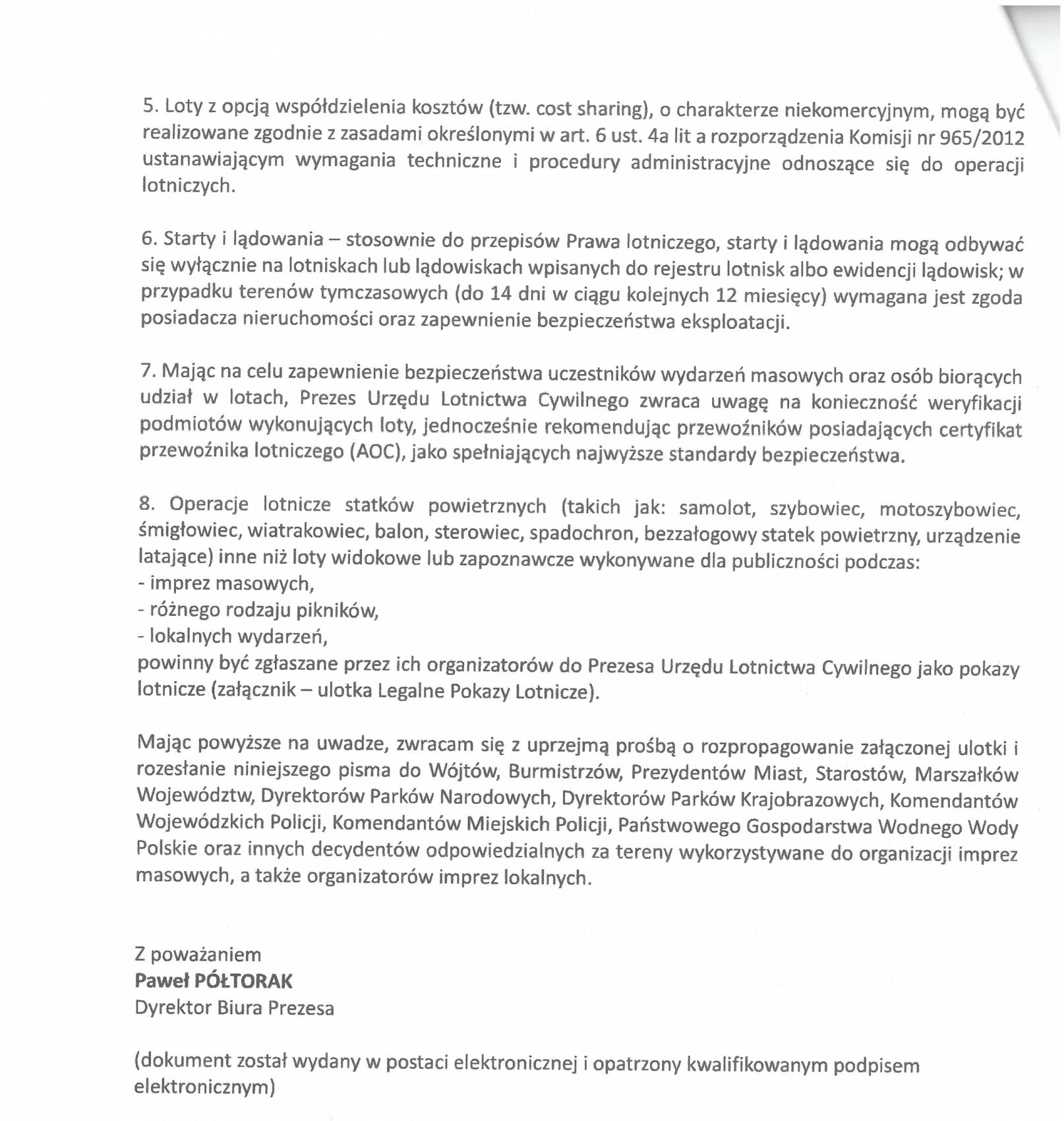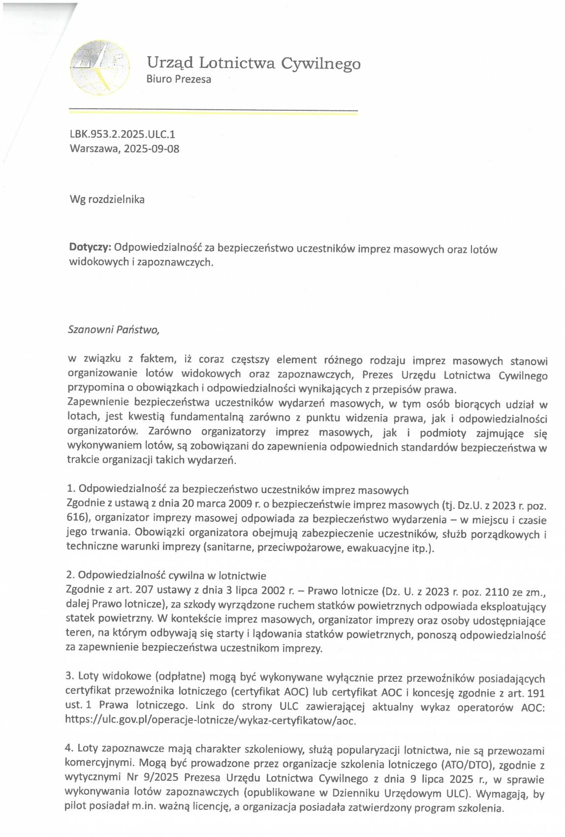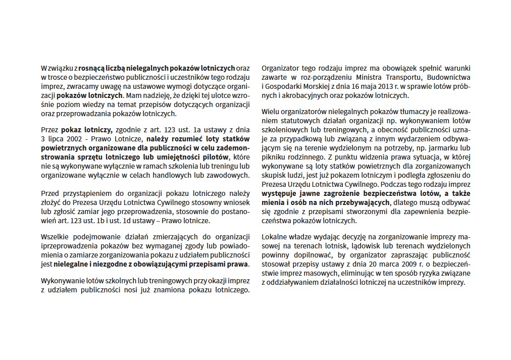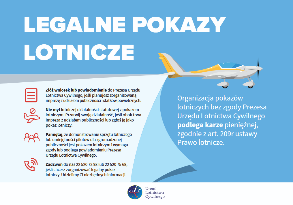 ​W związku z faktem, iż coraz częstszym elementem różnego rodzaju imprez masowych jest organizacja lotów widokowych oraz zapoznawczych udostępnianiamy informacje Prezesa Urzędu Lotnictwa Cywilnego dotyczącą obowiązków i odpowiedzialności organizatorów tych wydarzeń.