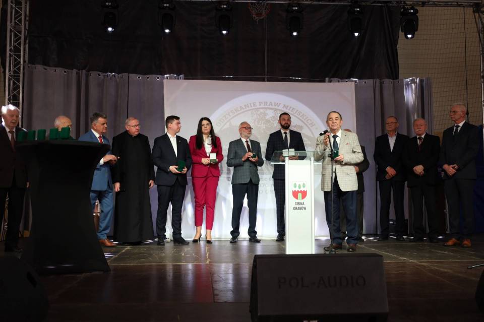 Głos zabrał Burmistrz Grabowa p. Janusz Jagodziński, który w swoim wystąpieniu podsumował starania i długą drogę zmierzającą do tego, by Grabów odzyskał prawa miejskie. W ramach podziękowania za trud włożony w pracę na rzecz Gminy Grabów Włodarz wręczył pamiątkowe medale dot. Odzyskania Praw Miejskich osobom, które w znaczny sposób wpłynęły na rozwój gminy.