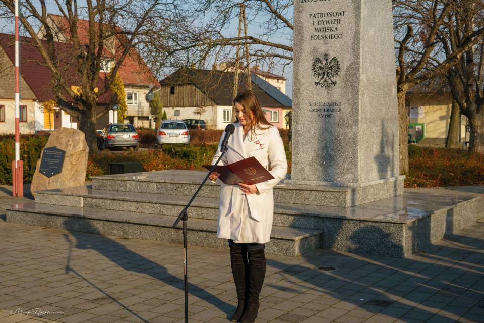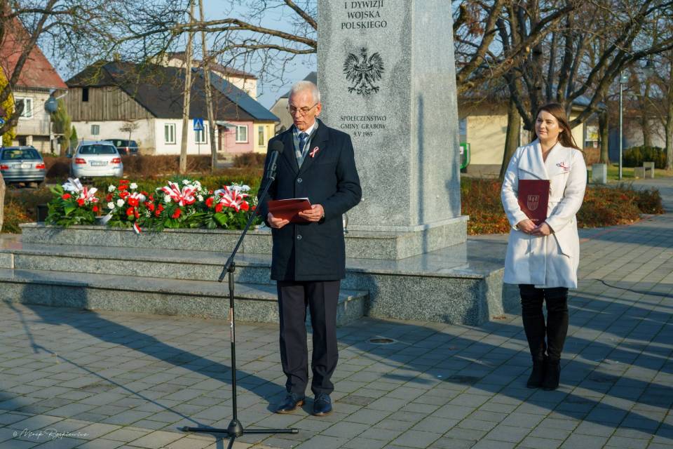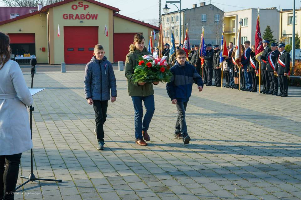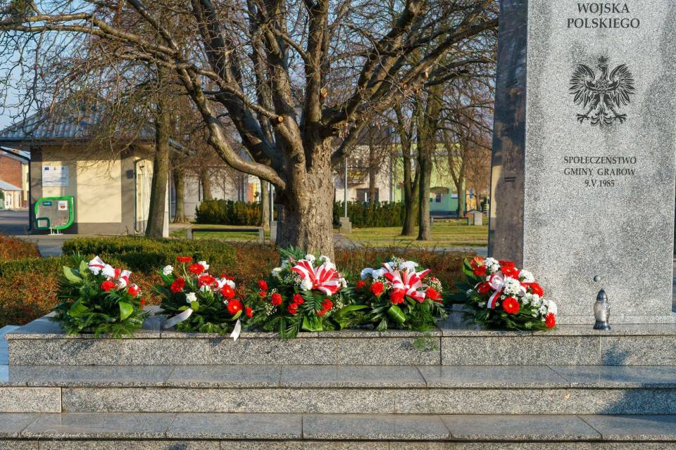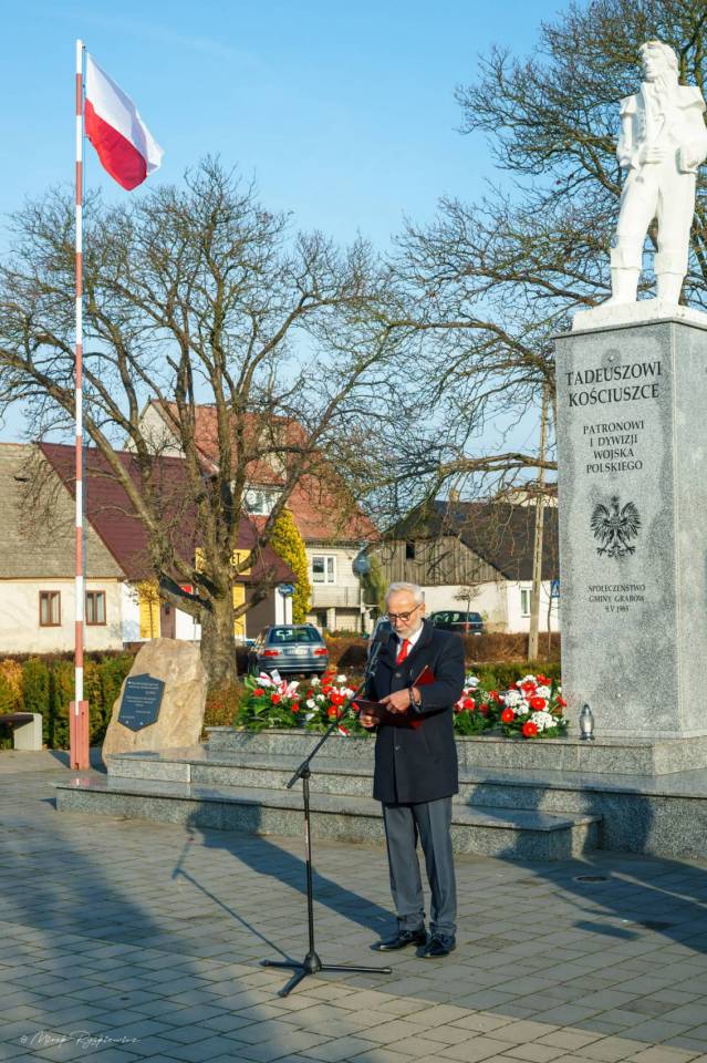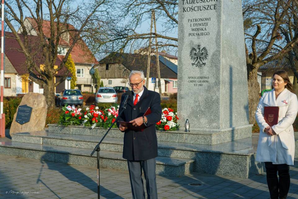 Następnie korowód przeniósł się pod Pomnik Tadeusza Kościuszki, gdzie poszczególne delegacje złożyły wieńce. Nastąpiło podniesienie flagi i oddanie meldunku przez Komendanta Zarządu Gminnego Związku OSP RP w Grabowie p. Pawła Łazińskiego. Pięknie wybrzmiał również ,,Mazurek Dąbrowskiego" w wykonaniu Gminnej Orkiestry Dętej. Swoje przemówienia wygłosili przedstawiciele władz gminnych: Wójt Gminy Grabów p. Janusz Jagodziński , Przewodniczący Rady Gminy p. Józef Drozdowski, a także Dyrektor Gminnego Centrum Kulturalno Bibliotecznego w Grabowie p. Paulina Frontczak-Pawłowska.