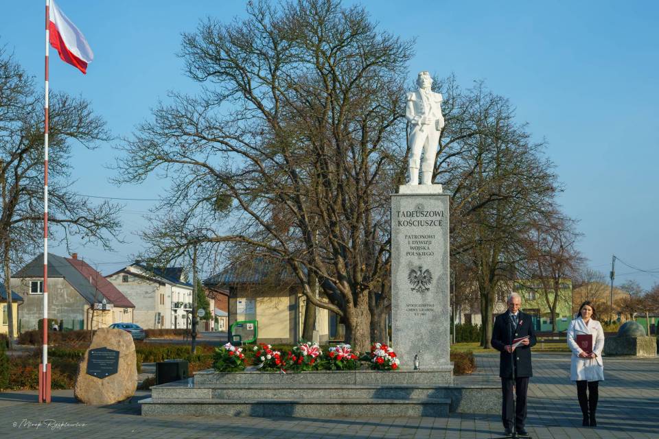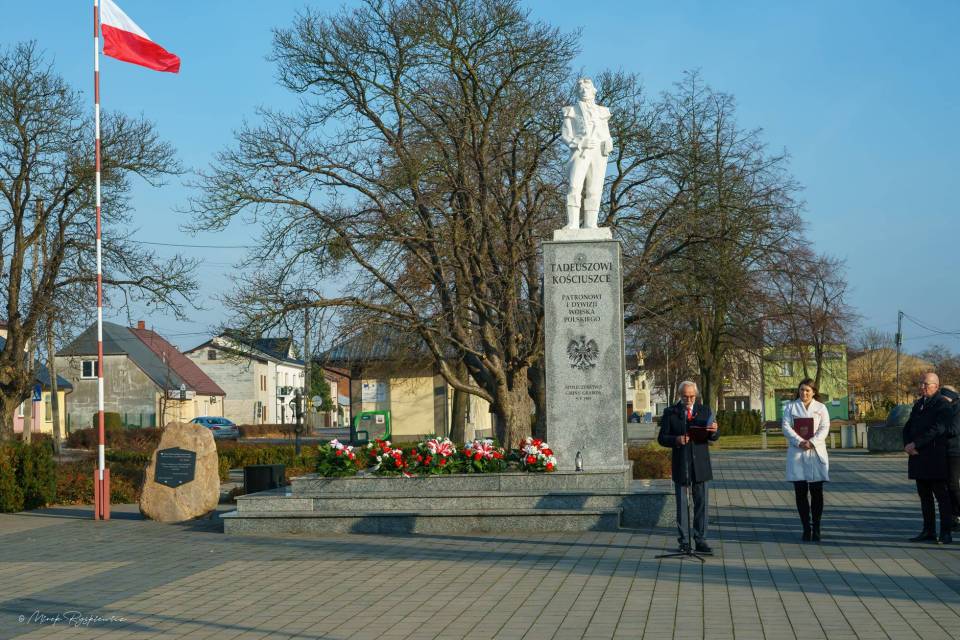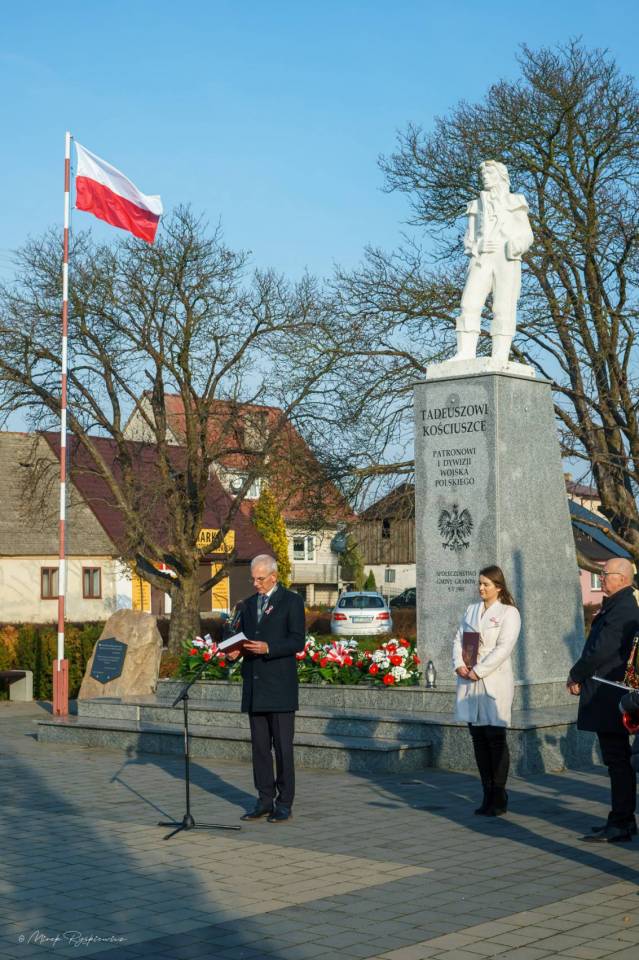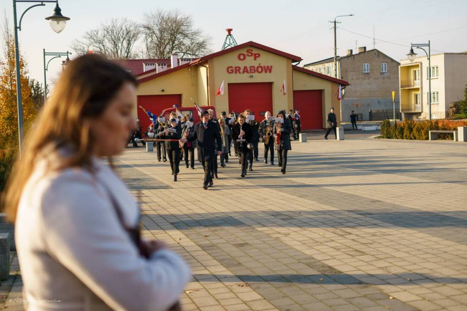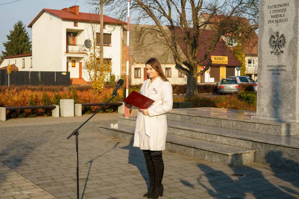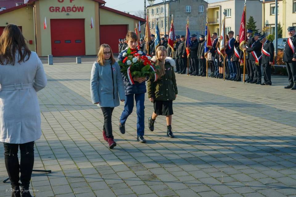 Następnie korowód przeniósł się pod Pomnik Tadeusza Kościuszki, gdzie poszczególne delegacje złożyły wieńce. Nastąpiło podniesienie flagi i oddanie meldunku przez Komendanta Zarządu Gminnego Związku OSP RP w Grabowie p. Pawła Łazińskiego. Pięknie wybrzmiał również ,,Mazurek Dąbrowskiego" w wykonaniu Gminnej Orkiestry Dętej. Swoje przemówienia wygłosili przedstawiciele władz gminnych: Wójt Gminy Grabów p. Janusz Jagodziński , Przewodniczący Rady Gminy p. Józef Drozdowski, a także Dyrektor Gminnego Centrum Kulturalno Bibliotecznego w Grabowie p. Paulina Frontczak-Pawłowska.