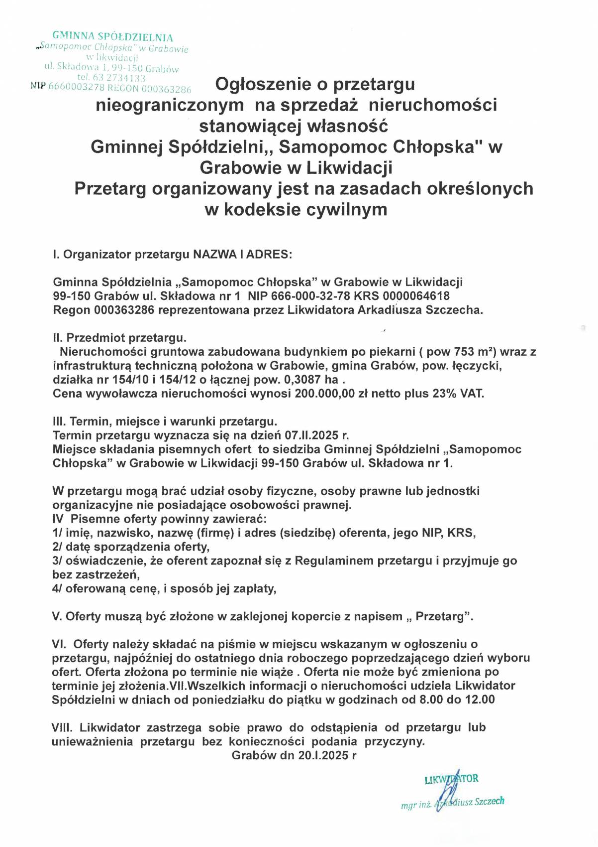 Ogłoszenie o przetargu nieograniczonym na sprzedaż nieruchomości, stanowiącej własność GS w Grabowie w miejscowości Grabów
