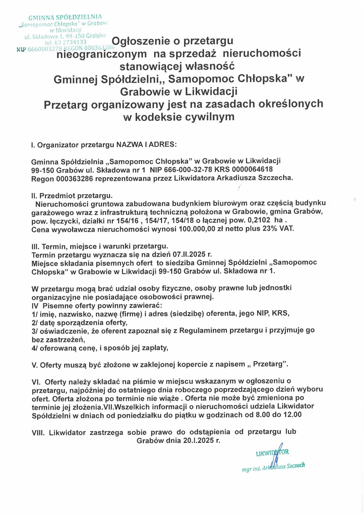 Ogłoszenie o przetargu nieograniczonym na sprzedaż nieruchomości, stanowiącej własność GS w Grabowie w miejscowości Grabów