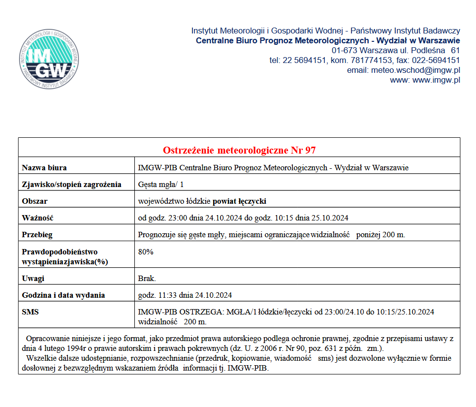 Ostrzeżenie meteorologiczne I stopnia GĘSTA MGŁA