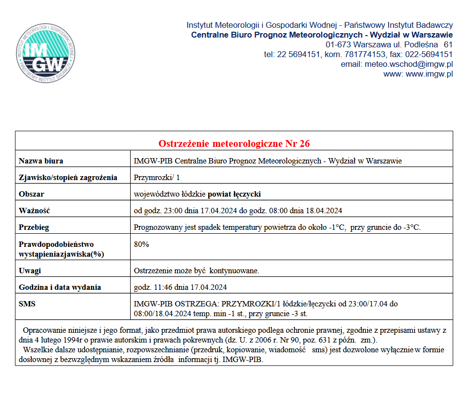 Ostrzeżenie meteorologiczne I stopnia Przymrozki