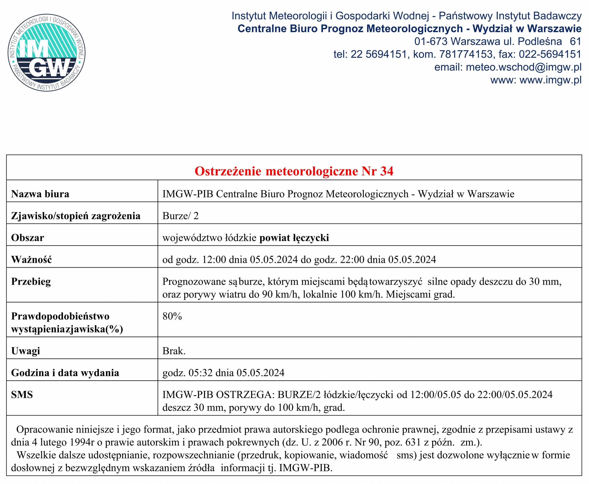Ostrzeżenie meteorologiczne II stopnia - Burze