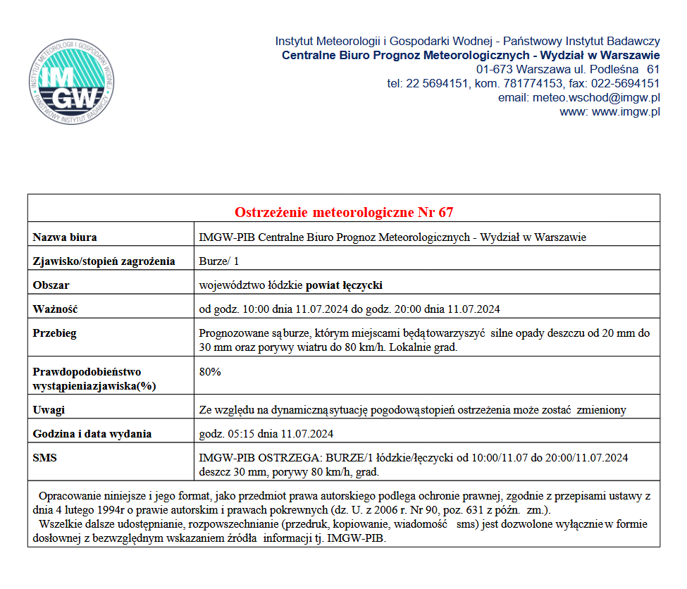 Ostrzeżenie meteorologiczne I stopnia BURZE