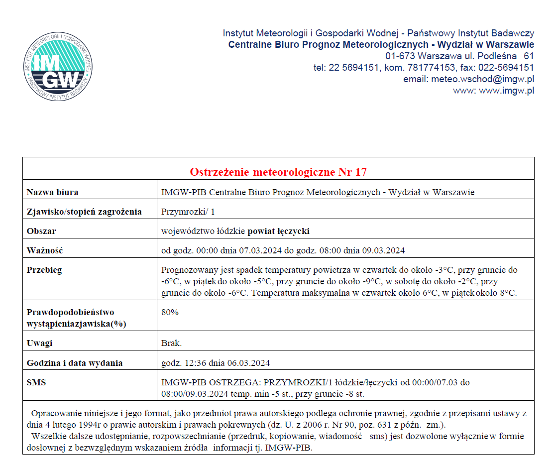 Ostrzeżenie meteorologiczne I stopnia Przymrozki
