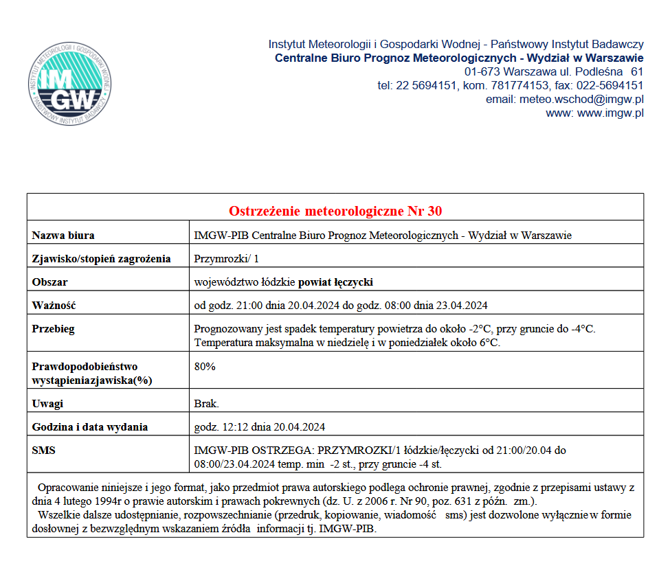 Ostrzeżenie meteorologiczne I stopnia Przymrozki