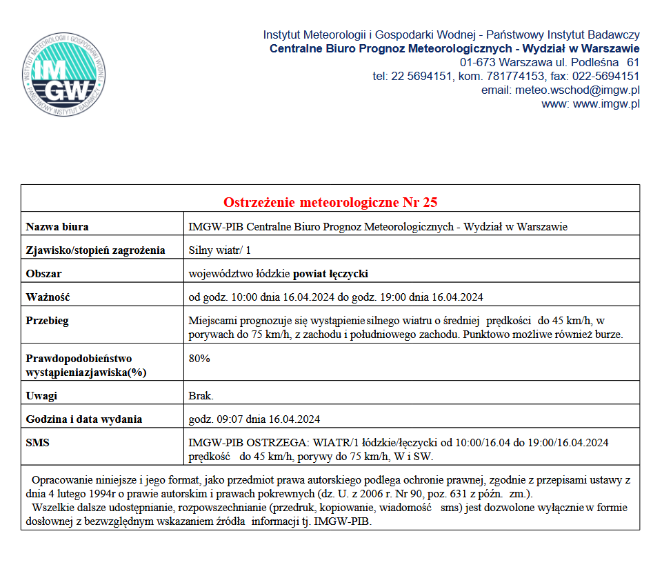 Ostrzeżenie meteorologiczne I stopnia - Silny wiatr