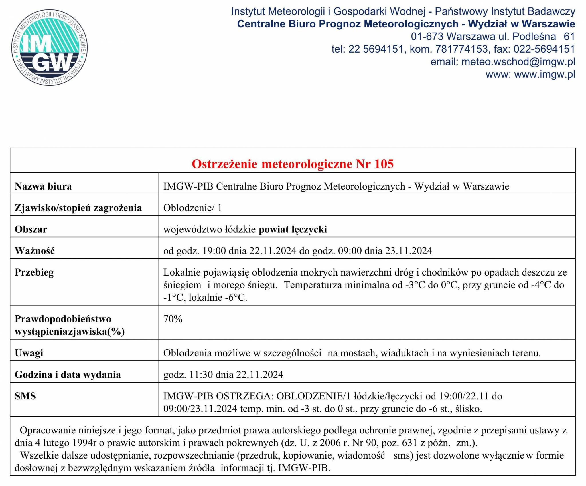 Ostrzeżenie meteorologiczne I stopnia OBLODZENIE