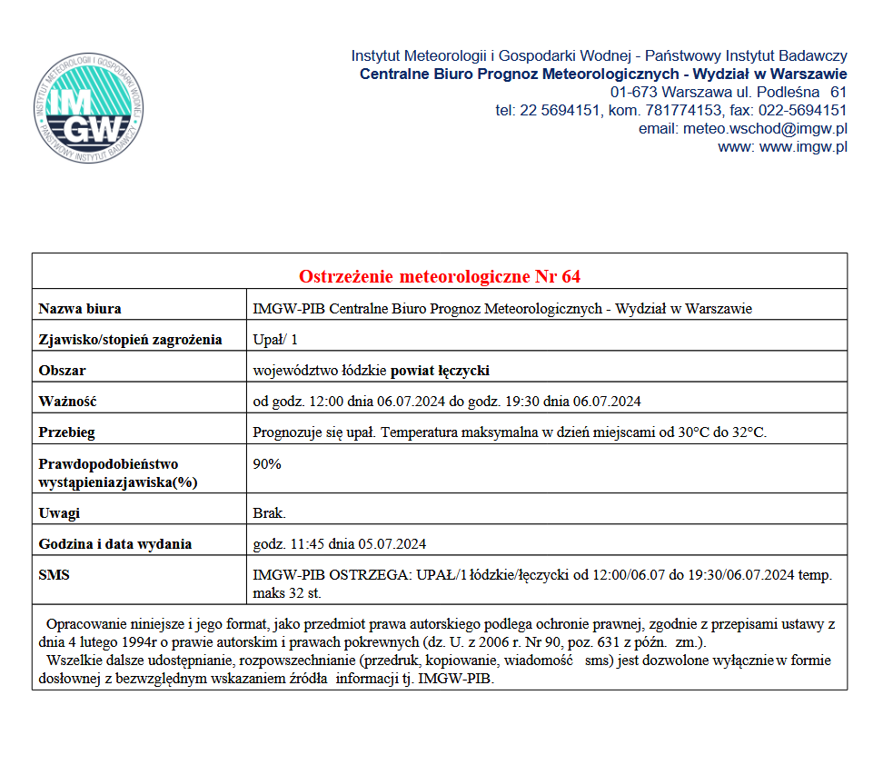 Ostrzeżenie meteorologiczne I stopnia UPAŁ