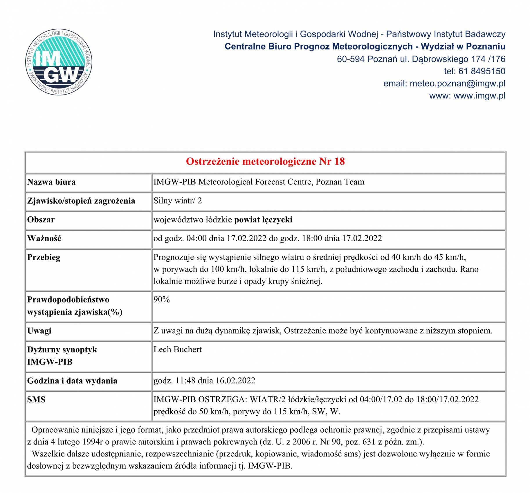 Prognozuje się wystąpienie silnego wiatru o średniej prędkości od 40 km/h do 45 km/h, w porywach do 100 km/h, lokalnie do 115 km/h, z południowego zachodu i zachodu. Rano lokalnie możliwe burze i opady krupy śnieżnej.