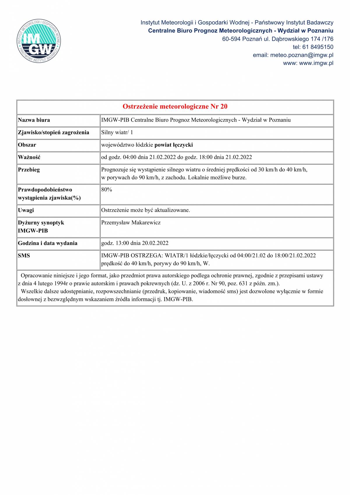 Prognozuje się wystąpienie silnego wiatru o średniej prędkości od 30 km/h do 40 km/h, w porywach do 90 km/h, z zachodu. Lokalnie możliwe burze.