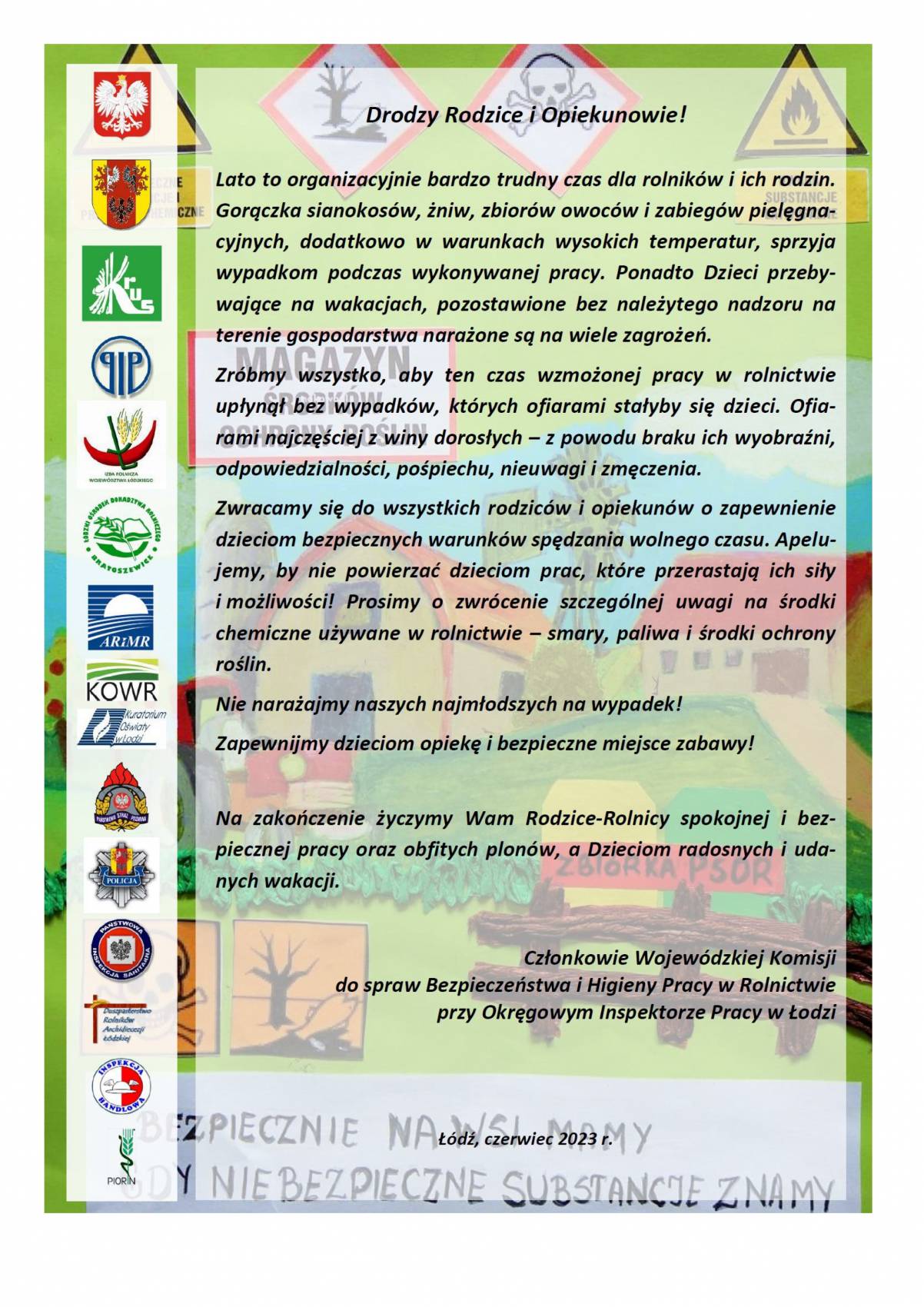 W załączeniu przekazuję również apel Wojewódzkiej Komisji ds. bhp w rolnictwie przy Okręgowym Inspektorze Pracy w Łodzi, dotyczący zapewniania bezpiecznych wakacji najmłodszym mieszkańcom wsi. Dzieci w okresie letnim są szczególnie narażone na różnego rodzaju zagrożenia w gospodarstwie rolnym. Przypominam także, że KRUS wykupił dla wszystkich dzieci rolników grupowe ubezpieczenie od nieszczęśliwych wypadków (NWW). Rodzice dziecka, które uległo wypadkowi, mogą złożyć wniosek o wypłatę odszkodowania do Towarzystwa Ubezpieczeń Wzajemnych AGRO Ubezpieczenia.