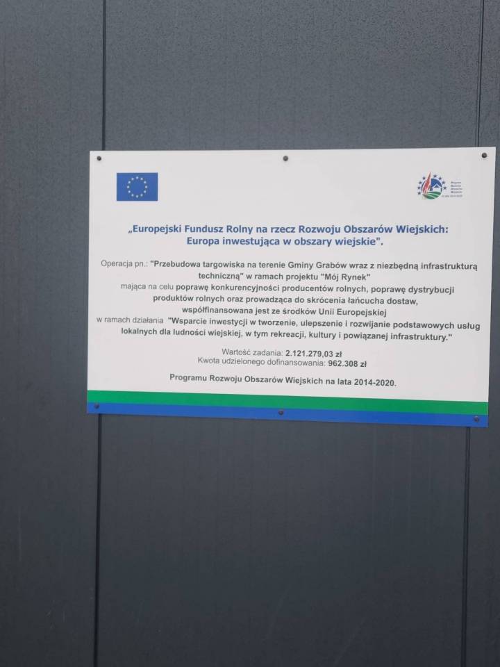 Na początku grudnia zostało zakończone zadanie pn.: „Przebudowa targowiska na terenie Gminy Grabów wraz z niezbędną infrastrukturą techniczną". W ramach ww. zadania ustawione zostały pomieszczenia kontenerowe jako zaplecze socjalno-biurowe, magazynowe oraz sanitarne targowiska, a także została wymieniona dotychczasowa nawierzchnia z płyt betonowych i trylinki na kostkę brukową pod stanowiska handlowe. Wybudowana została wiata handlowa, zmodernizowana została instalacja elektryczna, zamontowana została instalacja fotowoltaiczna o mocy 6 kW, zmodernizowana została sieć wodociągowa i kanalizacyjna. Koszt inwestycji 2 148 769,53 zł. Wykonawca firma Wiesława i Jan Łuczak z Uniejowa. Zadanie finansowane w wysokości 962 308,00 zł z Urzędu Marszałkowskiego Województwa Łódzkiego operacja typu '' Inwestycje w targowiska lub obiekty budowlane przeznaczone na cele promocji lokalnych produktów" w ramach poddziałania „Wsparcie inwestycji w tworzenie, ulepszenie i rozwijanie podstawowych usług lokalnych dla ludności wiejskiej, w tym rekreacji, kultury i powiązanej infrastruktury" objętego Programem Rozwoju Obszarów Wiejskich na lata 2014-2020.