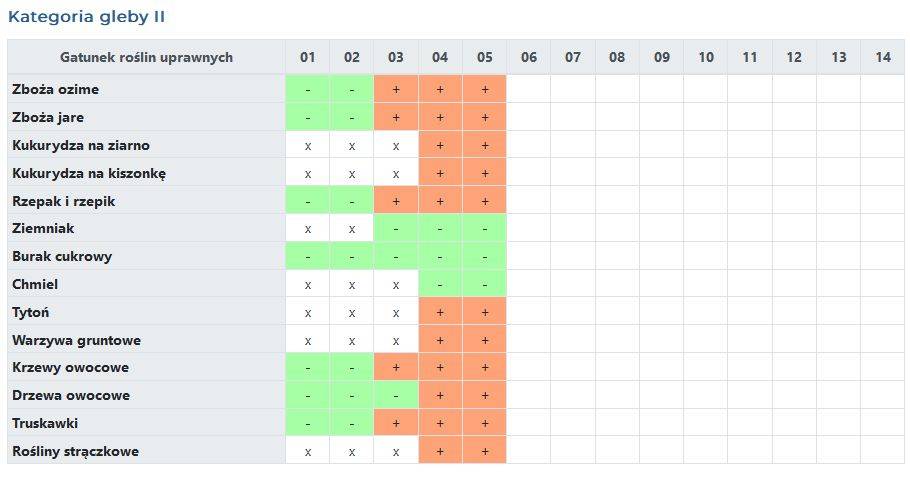 gleby kategorii II w uprawie zbóż jarych, ozimych, kukurydzy na ziarno i kiszonkę, rzepaku i rzepiku, tytoniu, warzyw gruntowych, krzewów owocowych, drzew owocowych, truskawek i roślin strączkowych;