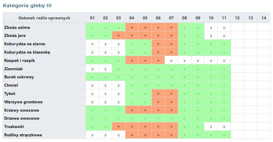 gleby kategorii III w uprawie zbóż jarych, ozimych, kukurydzy na ziarno, kukurydzy na kiszonkę, rzepaku i rzepiku, tytoniu, warzyw gruntowych,krzewów owocowych, truskawek i roślin strączkowych;