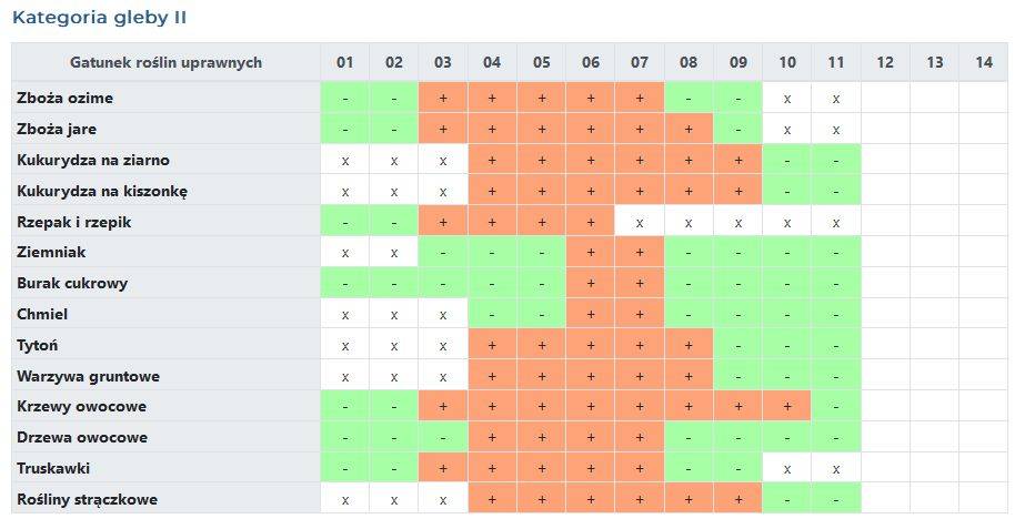 gleby kategorii II w uprawie zbóż jarych, ozimych, kukurydzy na ziarno, kukurydzy na kiszonkę, rzepaku i rzepiku, ziemniaków, buraka cukrowego, chmielu, tytoniu, warzyw gruntowych,krzewów owocowych, drzew owocowych, truskawek i roślin strączkowych;