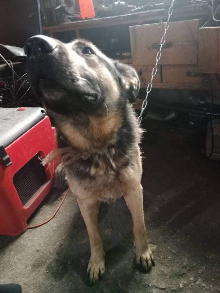 Jeden z piesków to dorosły Owczarek Niemiecki Krótkowłosy. Na szyi miał uwiązany łańcuch.