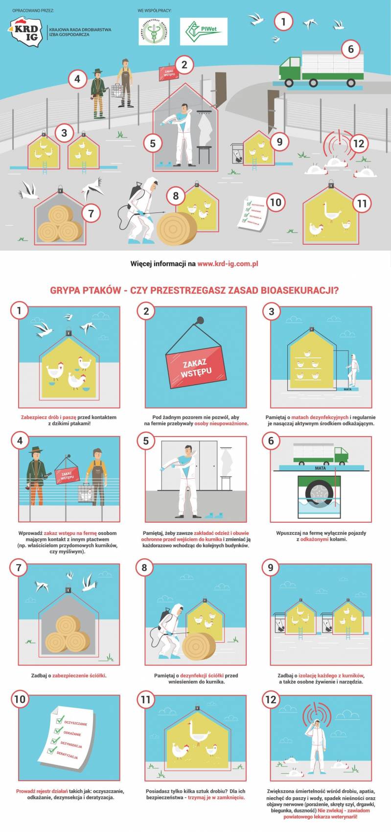 Powiatowy Lekarz Weterynarii w Kutnie, nakazuje na terenie powiatu łęczyckiego utrzymywanie, pojenie i karmienie drobiu w zamknięciu, informowanie Powiatowego Lekarza Weterynarii w Kutnie o wszelkich przemieszczeniach drobiu, utrzymywanie paszy i ściółki dla ptaków w sposób zabezpieczający przed kontaktem z gryzoniami oraz dzikimi ptakami i ich odchodami.