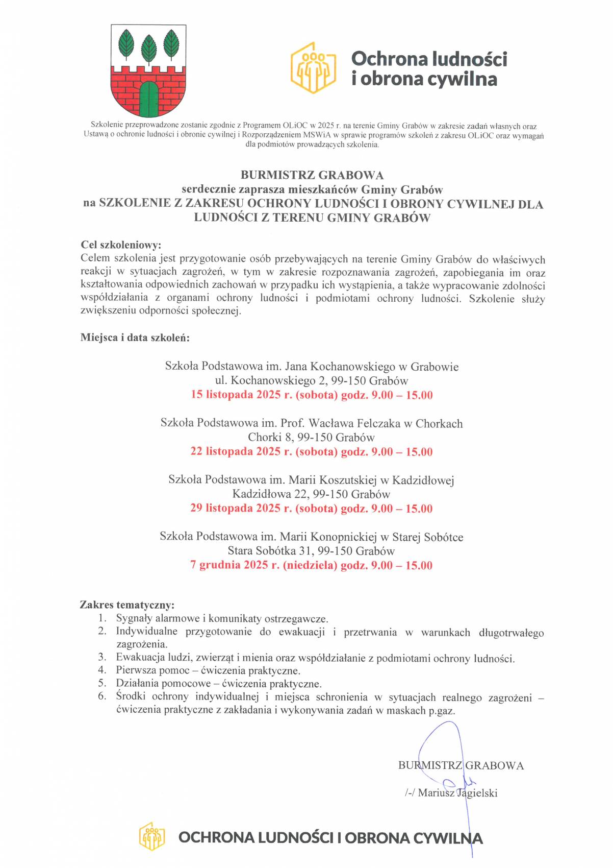 Zaproszenie Burmistrza Grabowa na szkolenie z zakresie ochrony ludności i obrony cywilnej dla ludności z terenu gminy Grabów